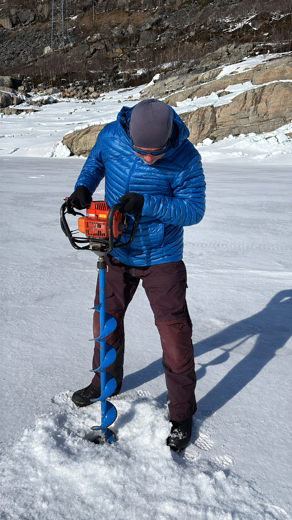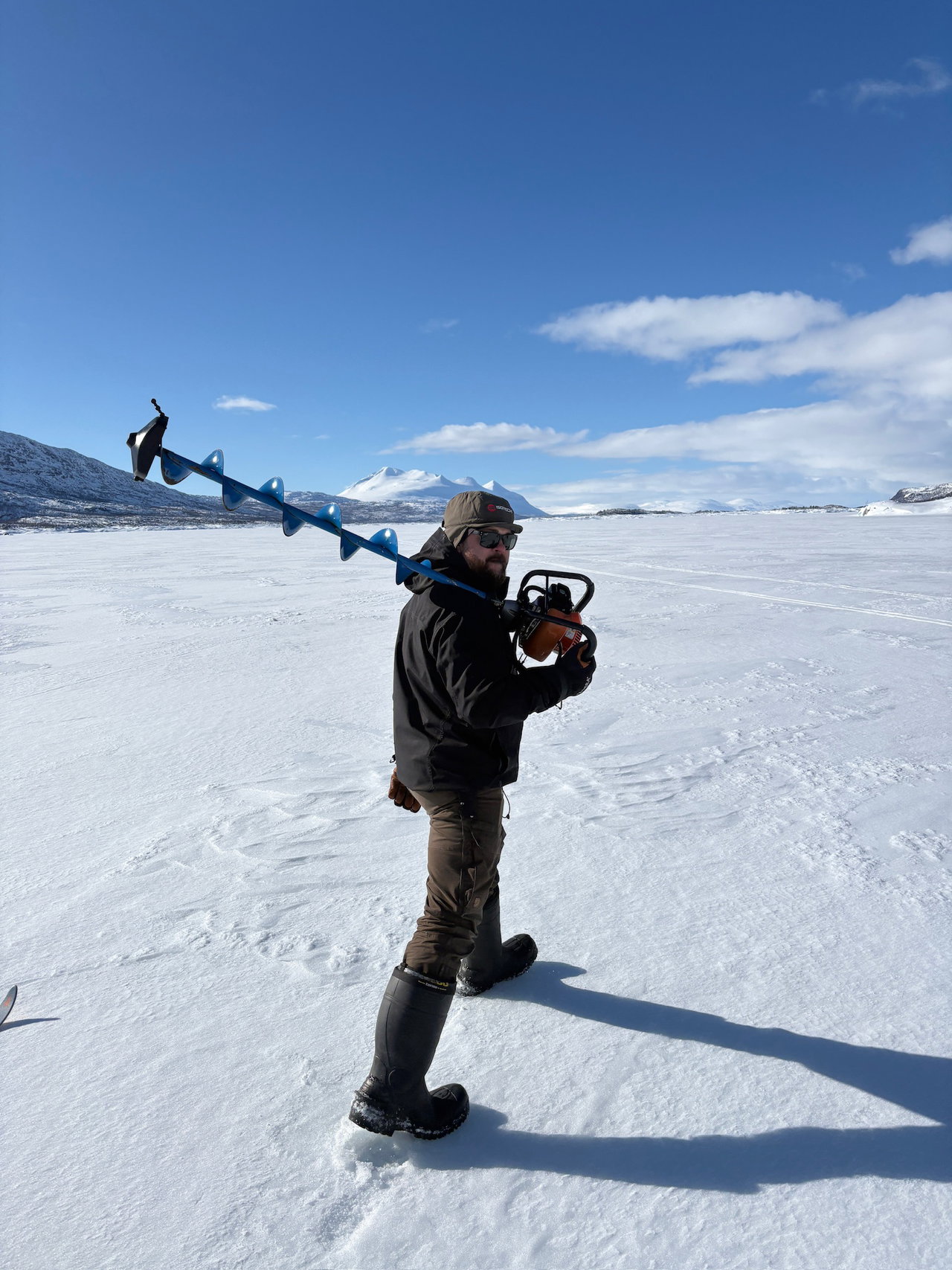 Later, Nicholas returns, lifting a petrol-powered auger from the back of his truck and carrying it onto the lake. His girlfriend, Stine, follows with rods and tackle.