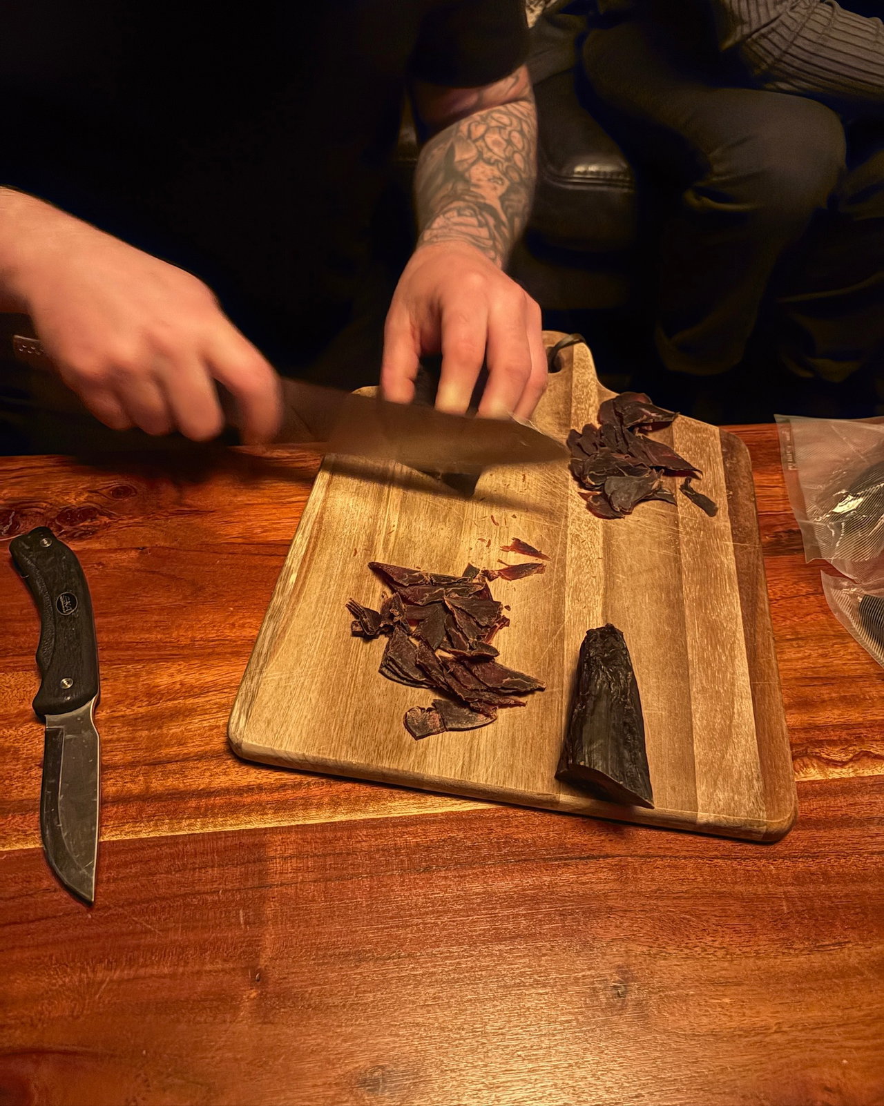 We sit by an open fire and chat to some locals. Nicholas is keen to share his smoked reindeer - most Swedes hunt and dry their own meat and fish. He cuts thin slices with a knife from his belt, and eats, accompanied by a glass of red.