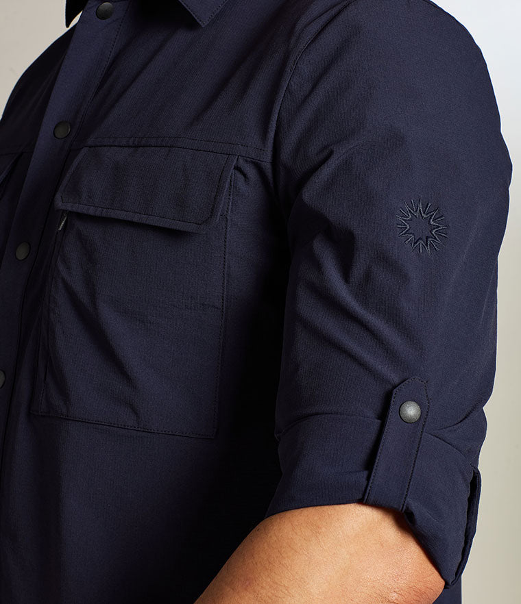 The Arica Technical Shirt offers high performance and comfort for desert and hiking adventures in warm conditions. Crafted from 4-way stretch fabric, it offers exceptional mobility and breathability. The back yoke vents, paired with open stretch mesh lining, ensure optimal airflow while laser-cut underarm ventilation holes enhance cooling. A throat latch and sun collar act as a sunscreen and protect against incursion of sand and dust. The shirt features roll-tab sleeves, chest flap pockets, including a concealed YKK zip pocket for secure storage. A lens cleaner and UPF 50+ finish ensure you're always ready for the elements, with a C0 DWR finish for added durability.